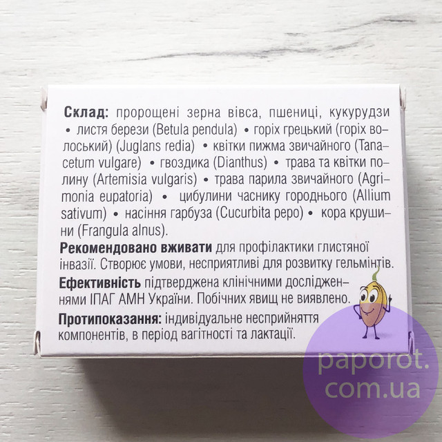 | Склад | Склад (рус • укр • lat) Прозери • Прозеры Береза (листья) • Береза(листя) • Betula pendula Орех грецкий • Горіх грецький • Juglans redia Пижма обыкновенная (цветки) • Пижмо звичайне (квітки) • Tanacetum vulgare Полынь (трава, цветки) • Полин (трава, квітки) • Artemisia vulgaris Репейничек (трава) • Парило звичайне (трава) • Agrimonia eupatoria Чеснок (луковицы) • Часник (цибулини) • Allium sativum Тыква (семена) • Гарбуз (насіння) • Cucurbita pepo Крушина (кора) • Крушина (кора) • Frangula alnus |