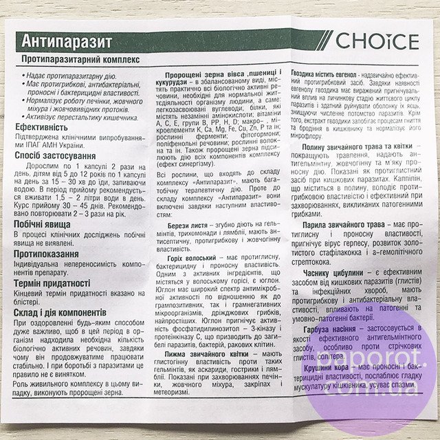 Антипаразит - проти паразитів, гельмінтів, глистів CHOICE (Чойс) 30 капсул