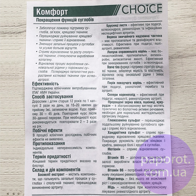 Комплекс «Комфорт» призначений для природному біокорекції суглобів. Він впливає на всі ланки патологічних порушень суглобової і хрящової тканини, допомагаючи справитися з дегенеративними процесами в суглобах.