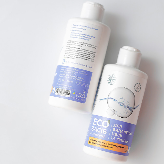 1. Попередньо очистити уражену ділянку у зручний спосіб (наприклад, ЕКОмолочком або ЕКОзасобом для ванної кімнати бренду GREEN MAX).